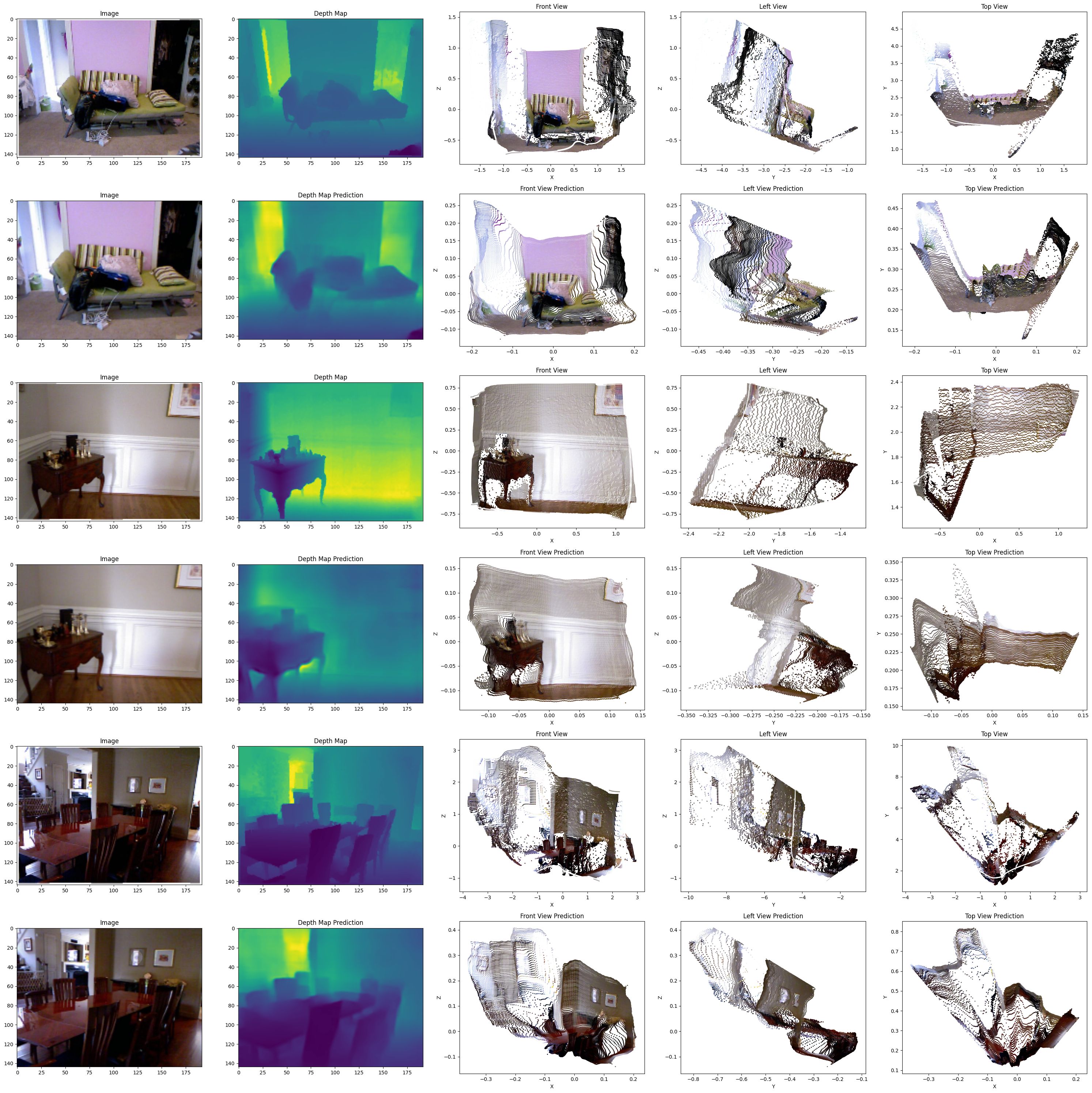 Qualitativly, we can see that the approach can capture the global shapes, but the point cloud are very distorded. For example if we compare the left views and top views between group truth and the prediction, we can see easily the huge difference which could be due to the depth prediction.